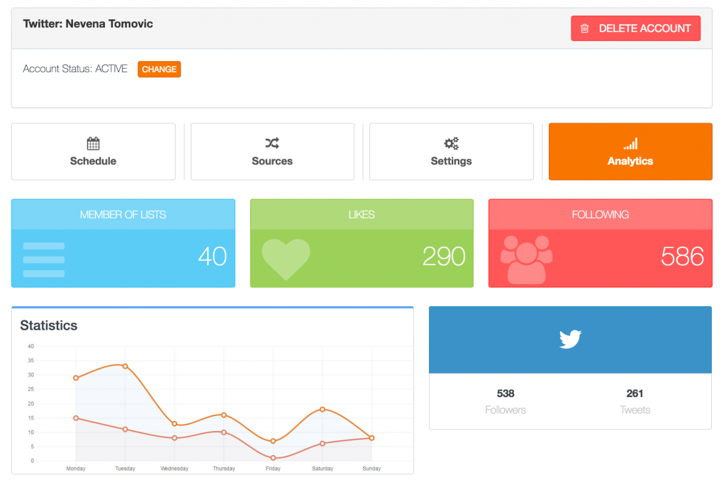 What I find most useful about Social Web Suite is the analytics sections. By clicking on one of your social profiles you can go in and schedule posts, add sources like your website for example, adjust the settings (hashtags, post settings, custom message, URL shorteners and so much more!), and then have an overview of your social account as if looking at Google Analytics. I am going to be brave and share with you my (not very active) Twitter account, so you can see what I mean.