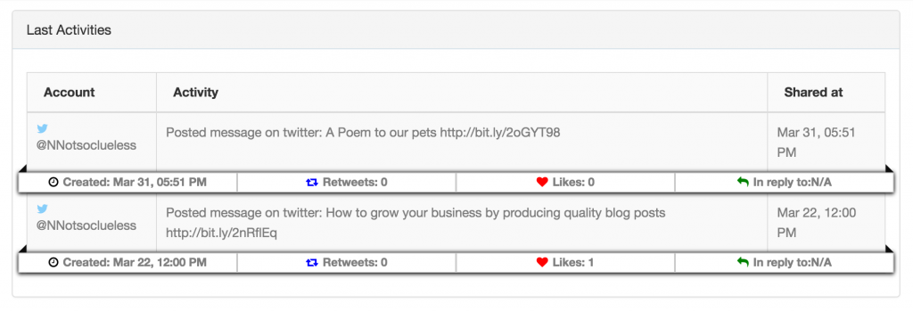 I find their dashboard really easy to navigate. On the left hand side you can see the “quick send” option, where you can just fire off a Tweet, and underneath you can see all of the social networks you connected, your websites and rss feeds. There is an activities log that will show you an overview of everything you have done on the platform.